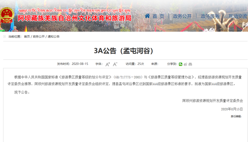 2020年8月,孟屯河谷景區(qū)多措并舉成功創(chuàng)建為國家AAA級(jí)旅游景區(qū),為理縣全域旅游建設(shè)新增了一張?zhí)厣?/span>