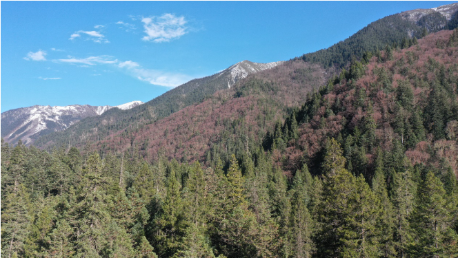 包干都山初夏繁花盛放,花期長達1月有余,當?shù)厝藗兎Q之為“格?;ā?。格?;ㄓ址Q格桑梅朵,具體為何種植物存在廣泛的爭議。在藏語中,“格?!笔恰懊篮脮r光”或“幸福”的意思,“梅朵”是花的意思,所以格?;ㄒ步行腋;?,長期以來一直寄托著藏族人民期盼幸福吉祥的美好情感。有豐富的森林景觀,以秋季彩林觀賞價值最高。