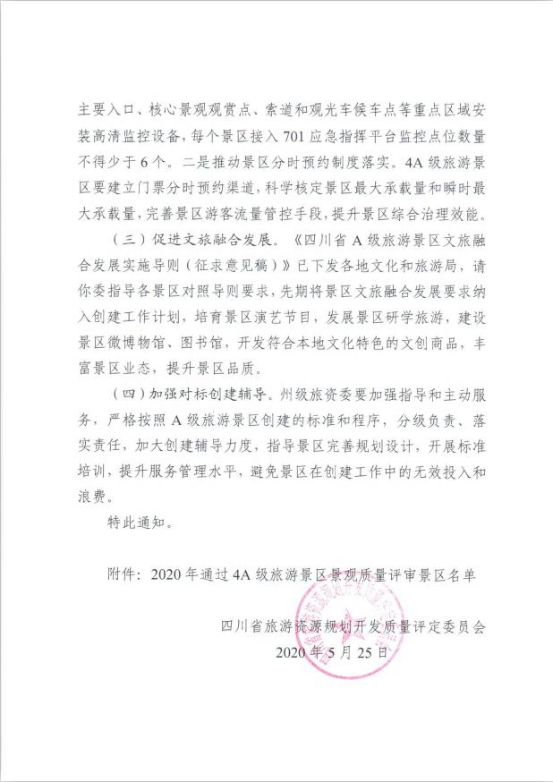 近日,四川省旅游資源規(guī)劃開發(fā)質(zhì)量評定委員會通報了2020年申報創(chuàng)建4A級旅游景區(qū)景觀資源與景觀質(zhì)量專家評審會結(jié)果。