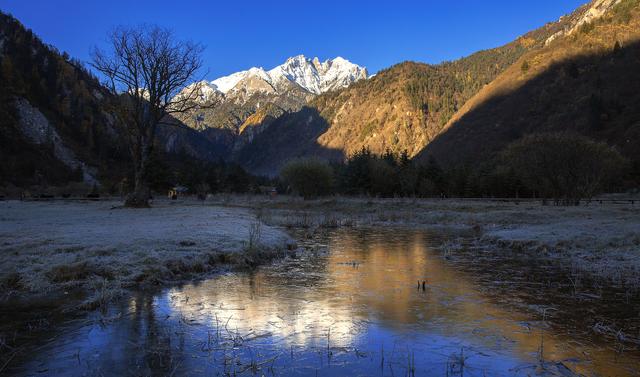 甘海子學(xué)名芳草海,位于松潘縣和九寨溝縣交界處的弓杠嶺,在九寨溝回成都的路旁能夠看到。這里原是一處高山湖泊,后因地質(zhì)變化,出水口擴大,所以當(dāng)?shù)匕傩账追Q“干海子”。其實,“干海子”并不干,這里四周遠(yuǎn)山層疊,森林茂密,海子中溪水蜿蜒,芳草萋萋,如天鵝絨地毯鋪滿大地,夏秋季野花點綴其間,牛羊騾馬成群,冬春時則一片深黃,與周圍的雪山紅葉相映成趣。因此,人們逐漸就把“干海子”叫成了“甘海子”。